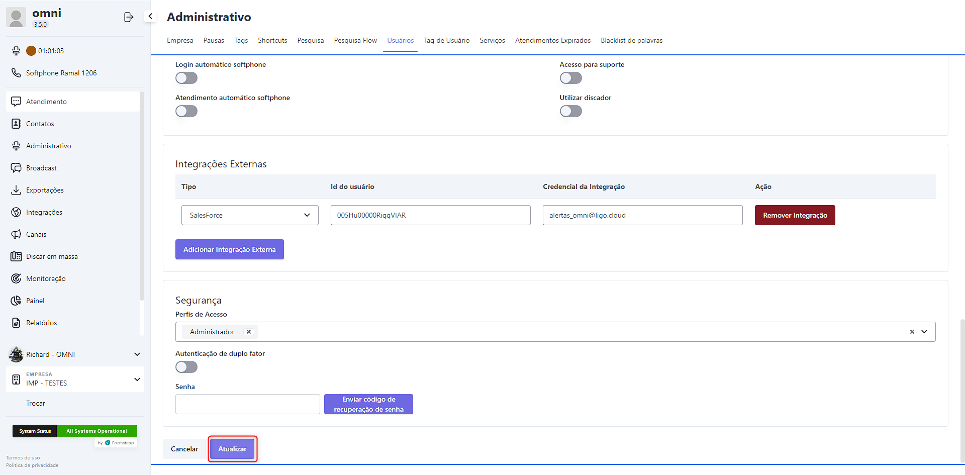 Depois de configurado a integração, basta salvar as alterações feitas no usuário, clicando no botão "Atualizar".