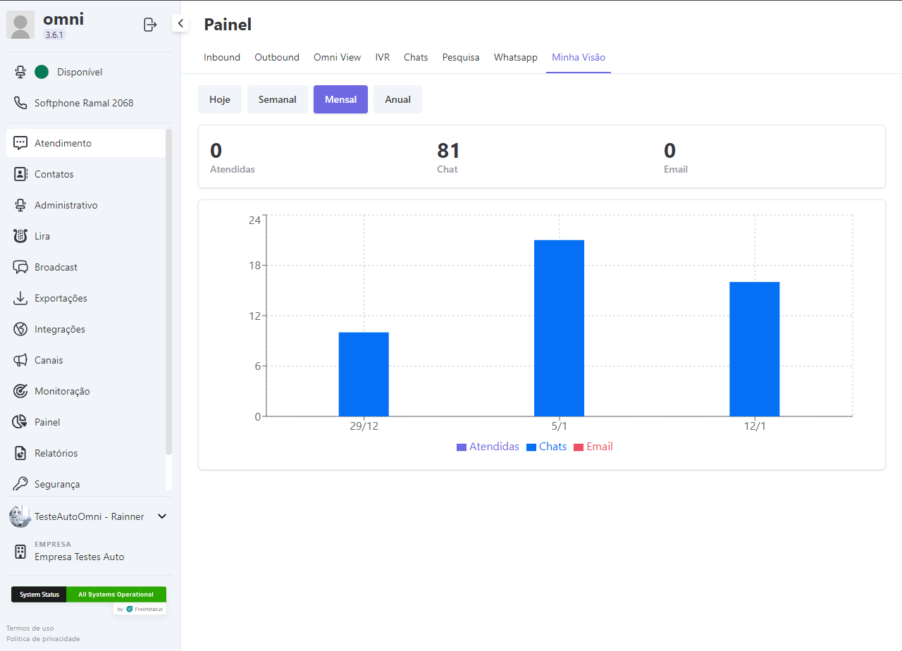 Este painel exibe informações sobre os atendimentos realizados pelo próprio usuário. Caso o usuário tenha acesso a esta tela, ele poderá visualizar o número de atendimentos realizados em chats, e-mails e atendidas.