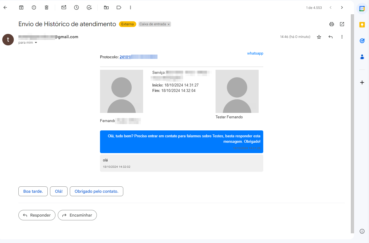 Caso o contato já tenha um e-mail cadastrado, ele aparecerá pré-preenchido. Se não houver e-mail cadastrado, ao preencher, o endereço será salvo no contato, armazenando a informação para futuros atendimentos.